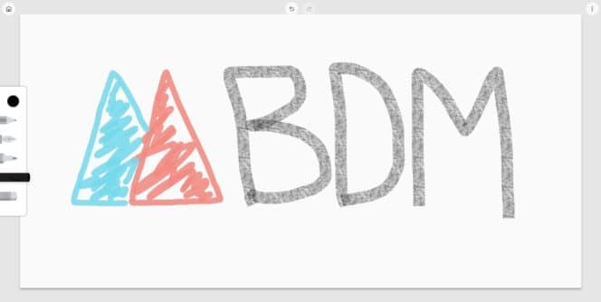 L’ outil en ligne s’appelle Google Drawing en français, Google Canvas en anglais. Au lancement, vous arrivez à une page blanche et quelques outils : un crayon, un stylo, un marqueur, une craie et une gomme. Sélectionnez simplement l’outil de votre choix pour commencer à dessiner. Les propriétés techniques de chaque outil sont reproduites : un dessin à la craie ne ressemblera pas à un dessin à la plume. Ci-dessous nous avons reproduit le logo BDM : les triangles ont été réalisés à l’aide du marqueur, nous avons opté pour la craie pour l’abréviation BDM. Les couleurs par défaut sont proposées et vous pouvez choisir une couleur personnalisée.
