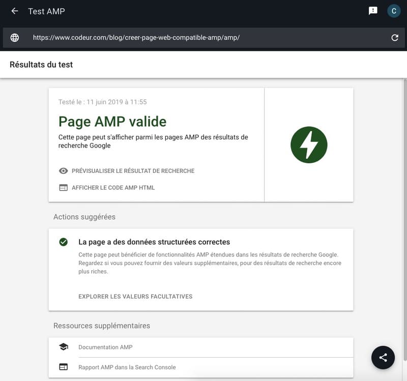L’outil de test AMP examine l’intégration des données structurées AMP sur vos pages et pointe les corrections nécessaires.